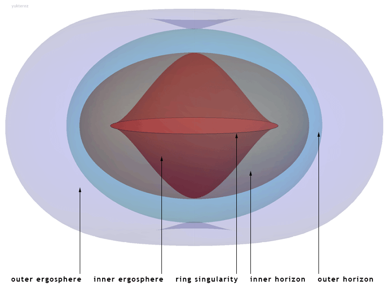 Maximally extended Penrose Diagram of a rotating black hole. Two parallel universes are connected to the given black hole. Rotation, via the Kerr metric, shows how inside the black hole the path of causality takes us through the wormhole in its interior. This wormhole in turn leads to a white hole which exits out into either one of two new parallel galaxies. [2]