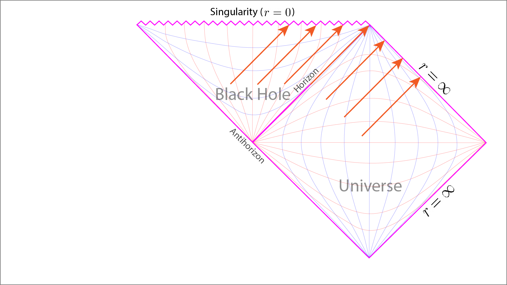 Penrose diagrams, or Carter-Penrose diagrams, are a variation to the Minkowski diagram. Named after Brandon Carter and Roger Penrose who were the first to use them these conformal diagrams employ a coordinate transformation that captures an infinite expanse of both space and time into a finite diagram. In order to understand why we need a coordinate transformation we first need to talk about singularities.
